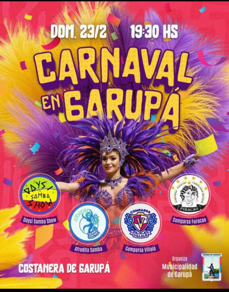 EL CARNAVAL EN GARUPÁ es de entrada libre y gratuita, solo se recomienda que los concurrentes lleguen con sus sillones para una mayor comodidad.
